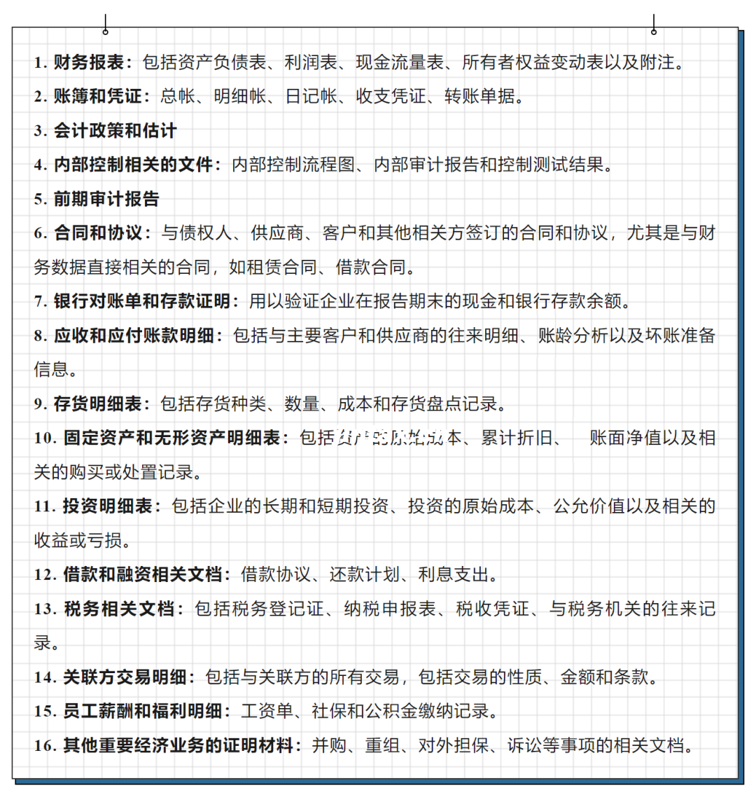 通常情況下,審計的內容也主要集中在資產負債表、損益表、現金流量表及合并報表四個方面。進行財務報表審計時,企業需要提供一系列詳細和完整的資料,這些資料通常包括: