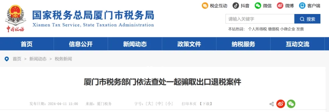 為規范出口退稅政策落實,助力穩外貿促發展,廈門市稅務局第一稽查局依法查處廈門某貿易有限公司騙取出口退稅案件。
